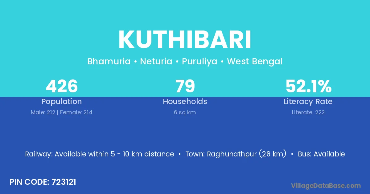 Raghunathpur (26 km) is the nearest town to Kuthibari village for major economic activities and is located approximately 26 km away.
