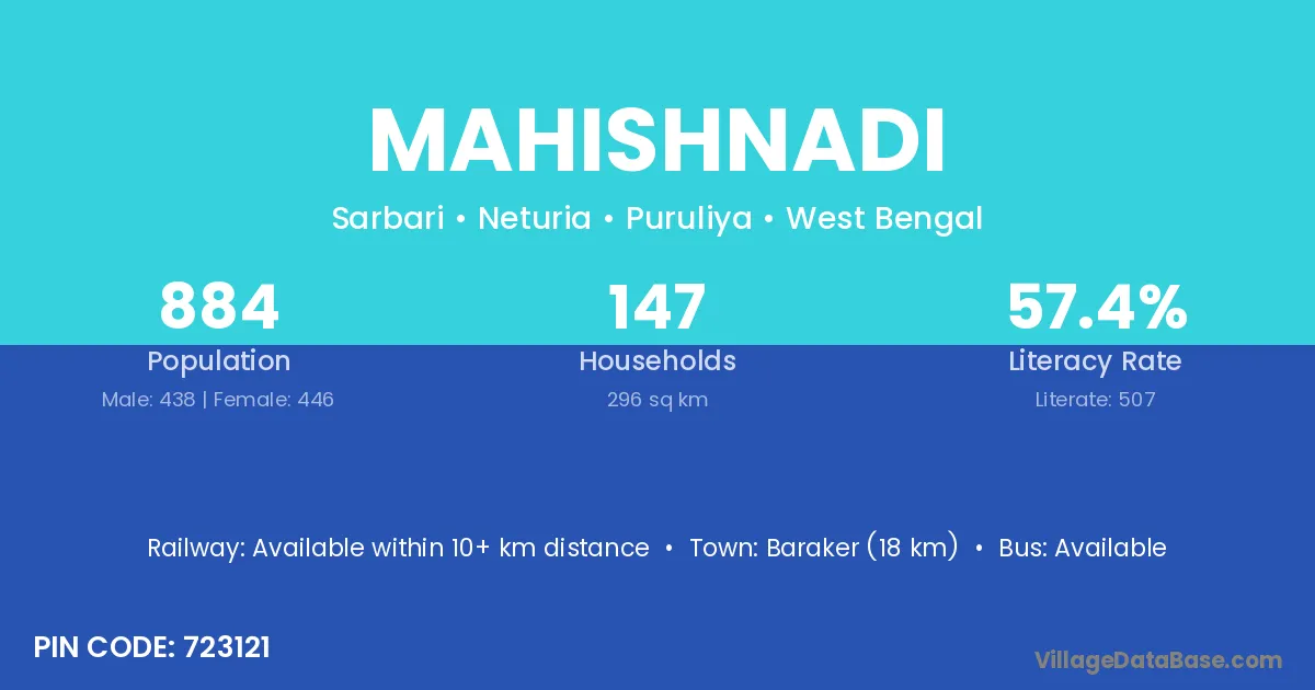 Baraker (18 km) is the nearest town to Mahishnadi village for major economic activities and is located approximately 18 km away.