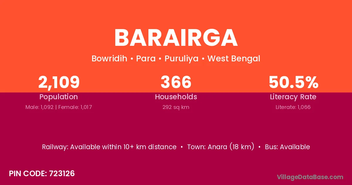 Barairga village has a total population of 2,109 people, of which 1,092 are males and 1,017 are females.
