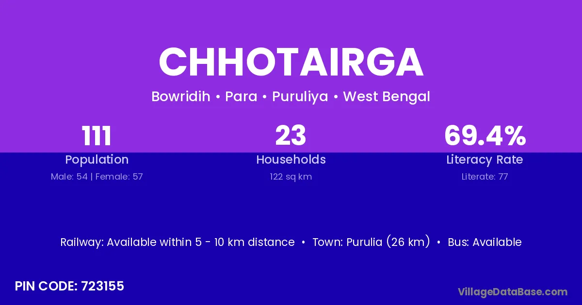 Purulia (26 km) is the nearest town to Chhotairga village for major economic activities and is located approximately 26 km away.