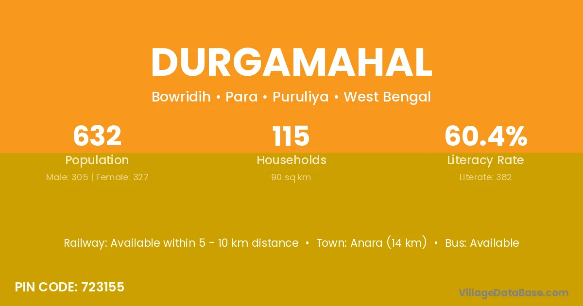 Anara (14 km) is the nearest town to Durgamahal village for major economic activities and is located approximately 14 km away.