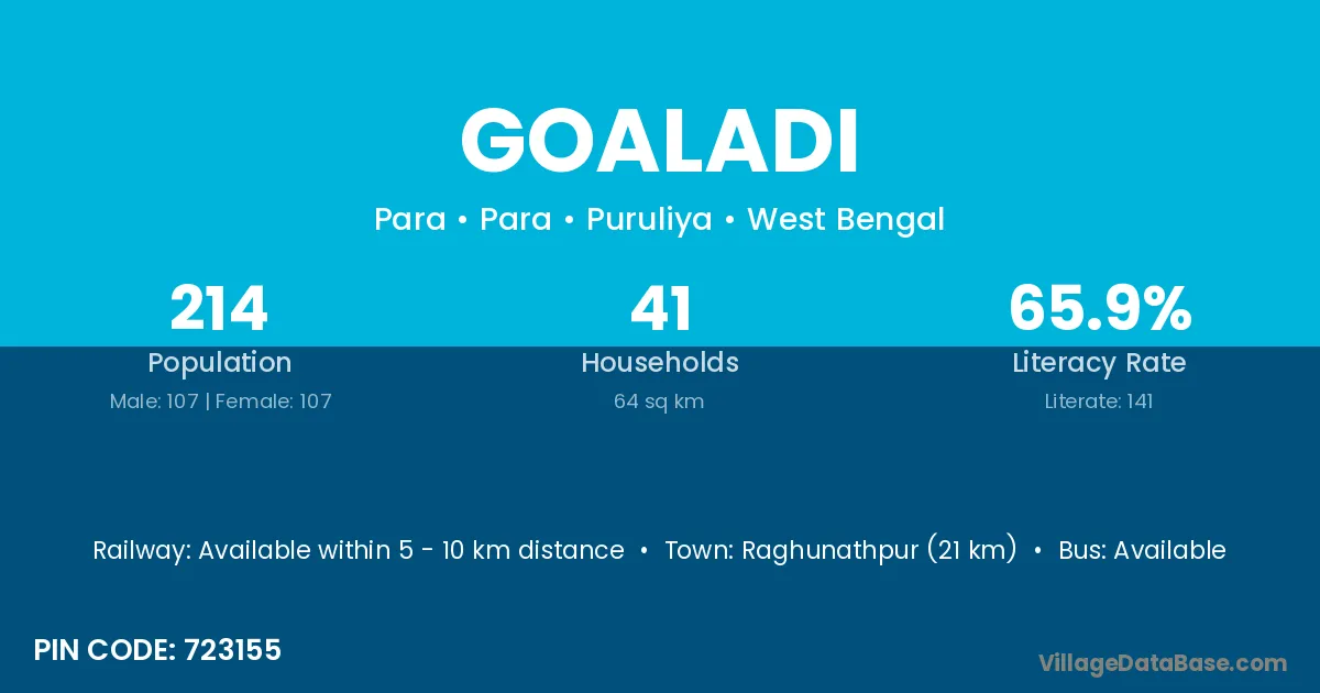 Raghunathpur (21 km) is the nearest town to Goaladi village for major economic activities and is located approximately 21 km away.