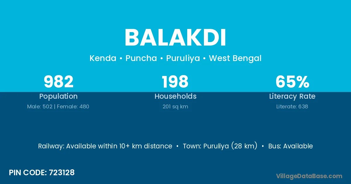 Puruliya (28 km) is the nearest town to Balakdi village for major economic activities and is located approximately 28 km away.