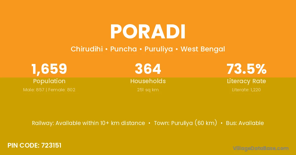 Puruliya (60 km) is the nearest town to Poradi village for major economic activities and is located approximately 60 km away.
