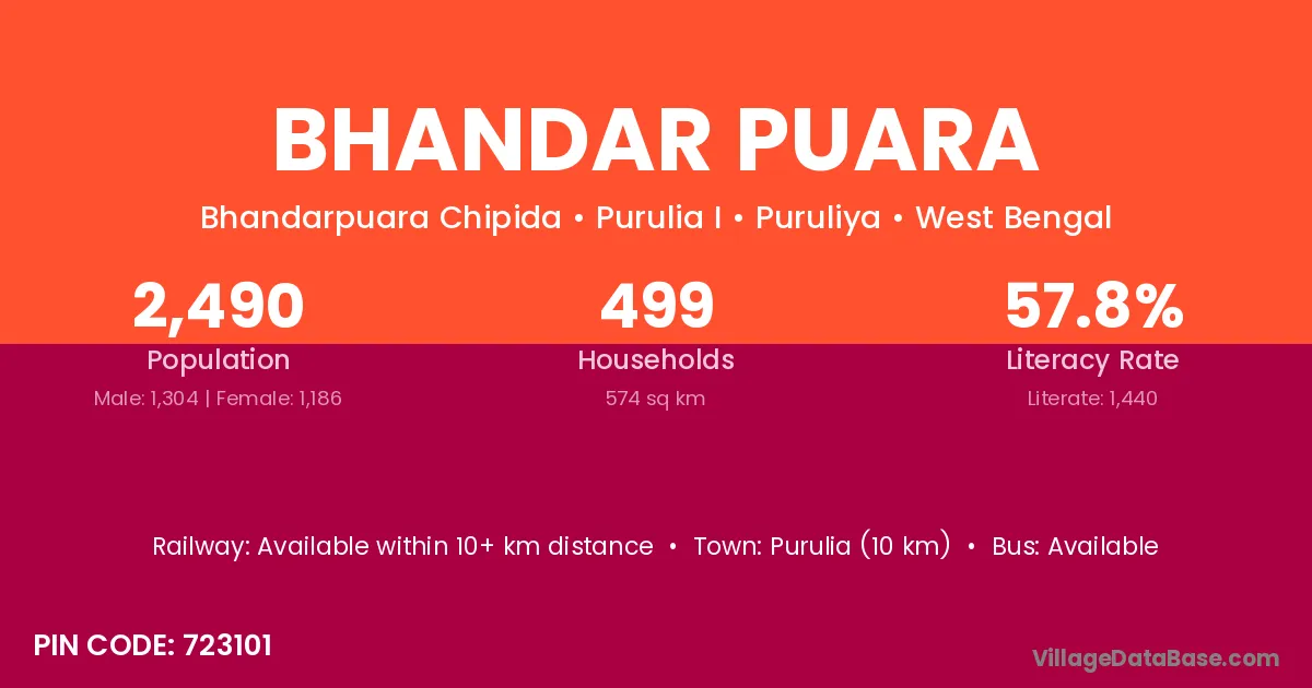 Purulia (10 km) is the nearest town to Bhandar Puara village for major economic activities and is located approximately 10 km away.