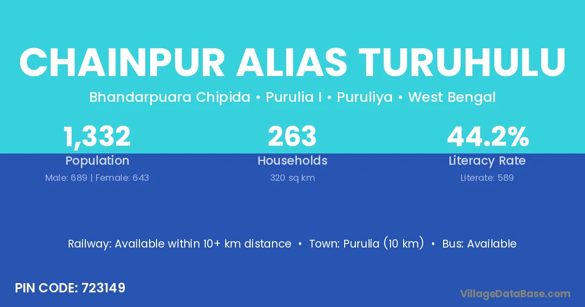 Purulia (10 km) is the nearest town to Chainpur Alias Turuhulu village for major economic activities and is located approximately 10 km away.
