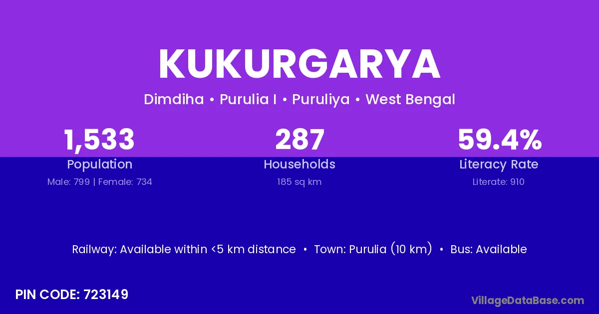 Purulia (10 km) is the nearest town to Kukurgarya village for major economic activities and is located approximately 10 km away.