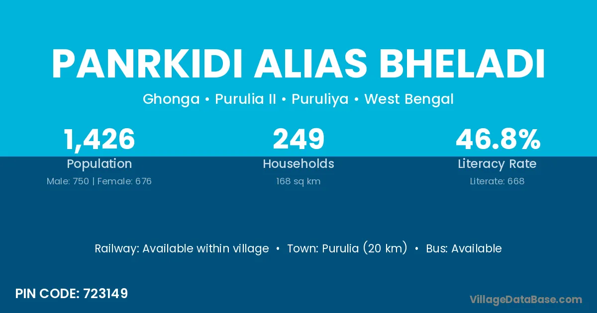 Purulia (20 km) is the nearest town to Panrkidi Alias Bheladi village for major economic activities and is located approximately 20 km away.
