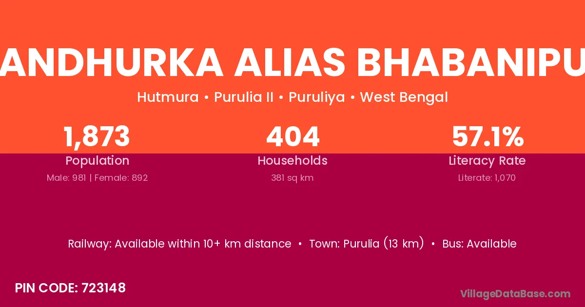 Purulia (13 km) is the nearest town to Kandhurka Alias Bhabanipur village for major economic activities and is located approximately 13 km away.