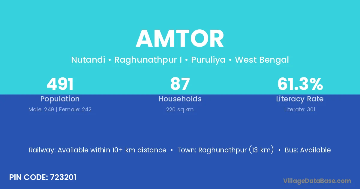 Raghunathpur (13 km) is the nearest town to Amtor village for major economic activities and is located approximately 13 km away.