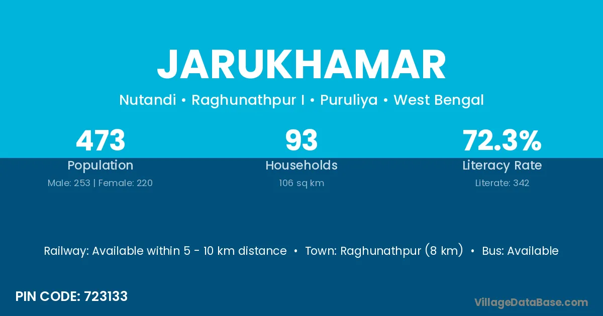 Raghunathpur (8 km) is the nearest town to Jarukhamar village for major economic activities and is located approximately 8 km away.