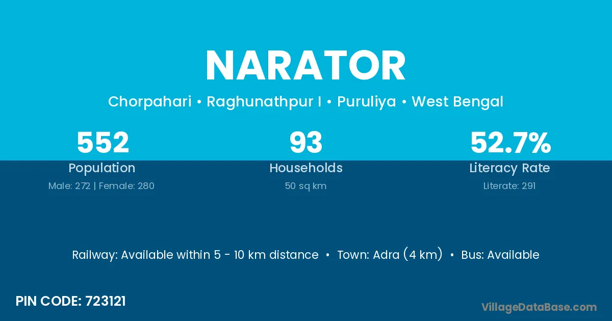 According to Census 2011 information, the village code of Narator village is 723121.