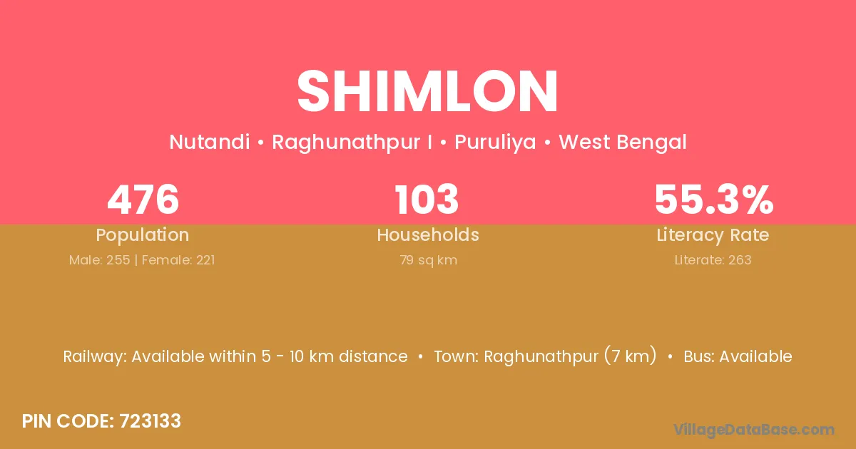 Raghunathpur (7 km) is the nearest town to Shimlon village for major economic activities and is located approximately 7 km away.