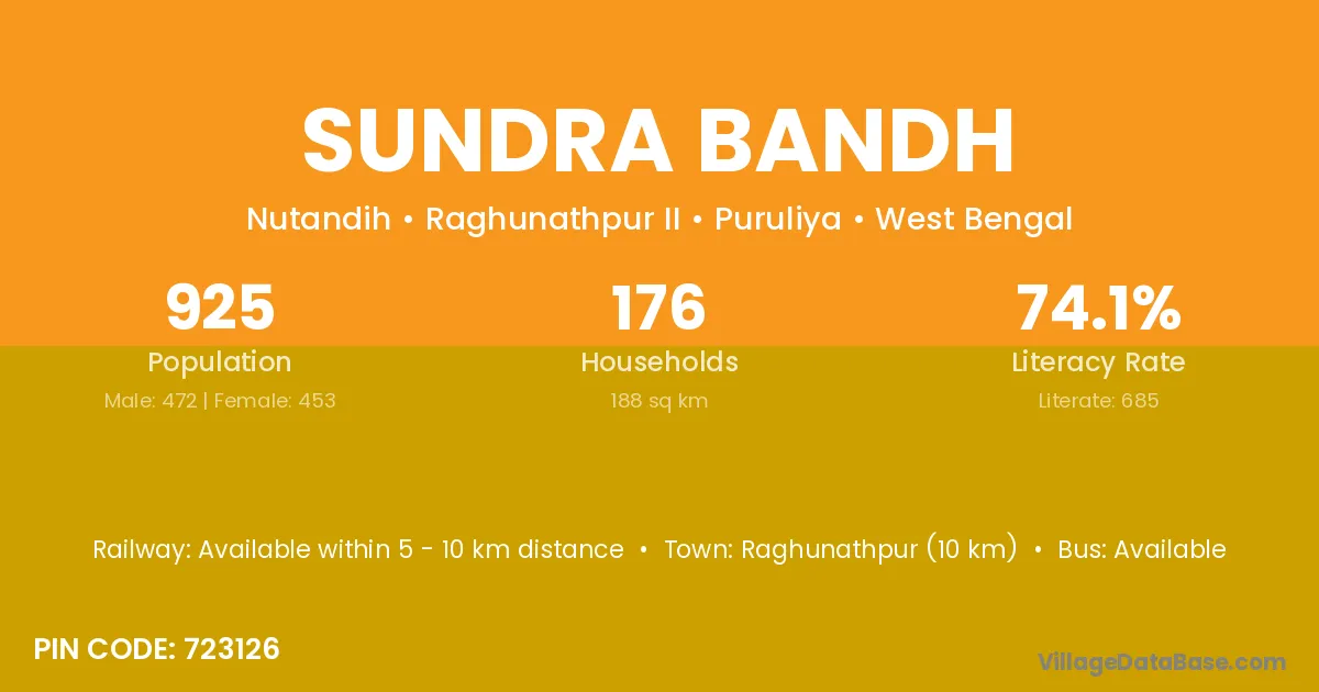 Raghunathpur (10 km) is the nearest town to Sundra Bandh village for major economic activities and is located approximately 10 km away.