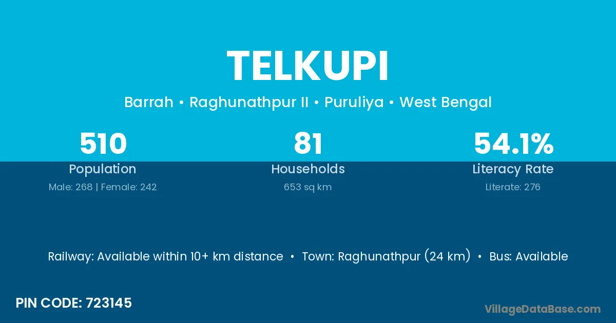 Raghunathpur (24 km) is the nearest town to Telkupi village for major economic activities and is located approximately 24 km away.