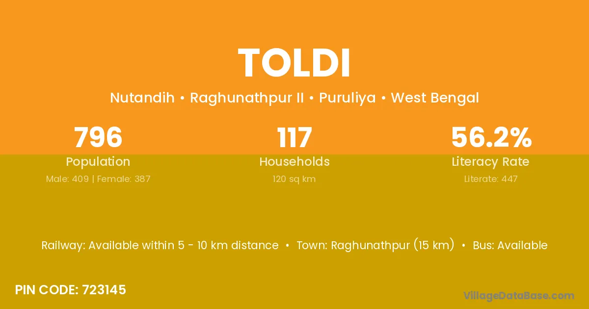 Raghunathpur (15 km) is the nearest town to Toldi village for major economic activities and is located approximately 15 km away.