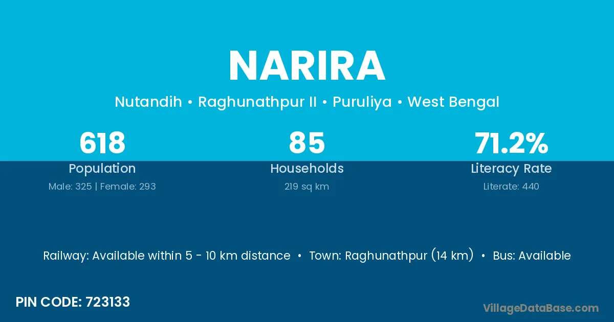 Raghunathpur (14 km) is the nearest town to Narira village for major economic activities and is located approximately 14 km away.