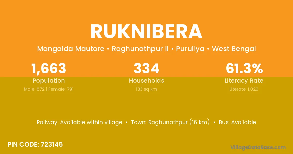 Raghunathpur (16 km) is the nearest town to Ruknibera village for major economic activities and is located approximately 16 km away.
