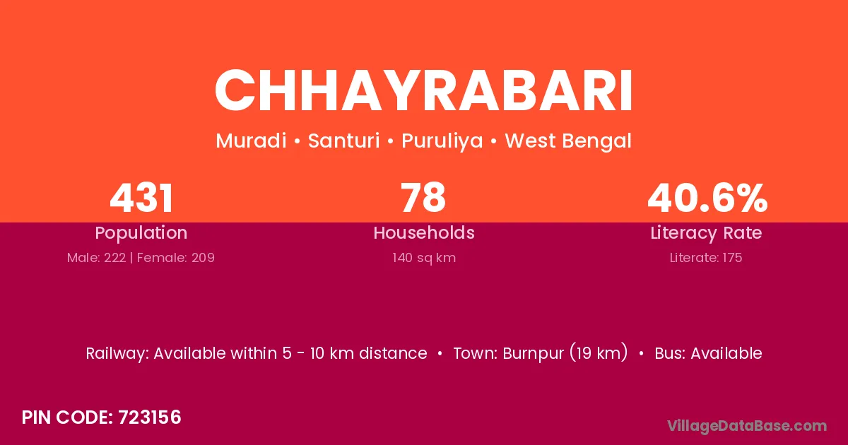 Burnpur (19 km) is the nearest town to Chhayrabari village for major economic activities and is located approximately 19 km away.