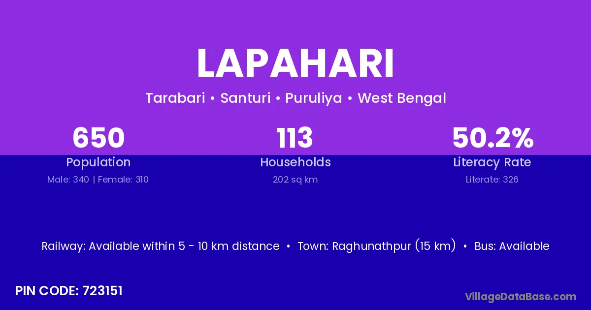 Raghunathpur (15 km) is the nearest town to Lapahari village for major economic activities and is located approximately 15 km away.