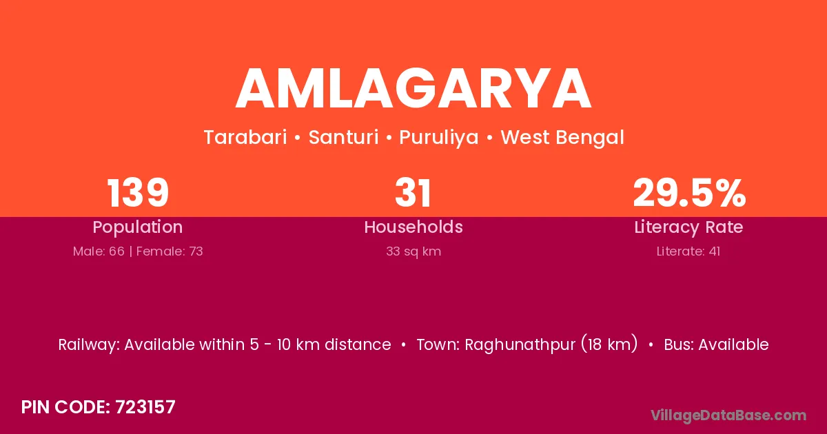 Raghunathpur (18 km) is the nearest town to Amlagarya village for major economic activities and is located approximately 18 km away.