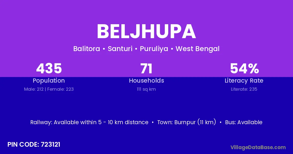 Burnpur (11 km) is the nearest town to Beljhupa village for major economic activities and is located approximately 11 km away.
