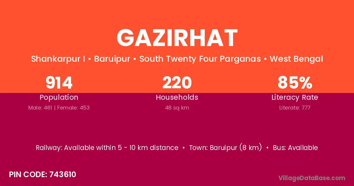Gazirhat village is located in the Baruipur Subdivision of the South Twenty Four Parganas district in West Bengal.