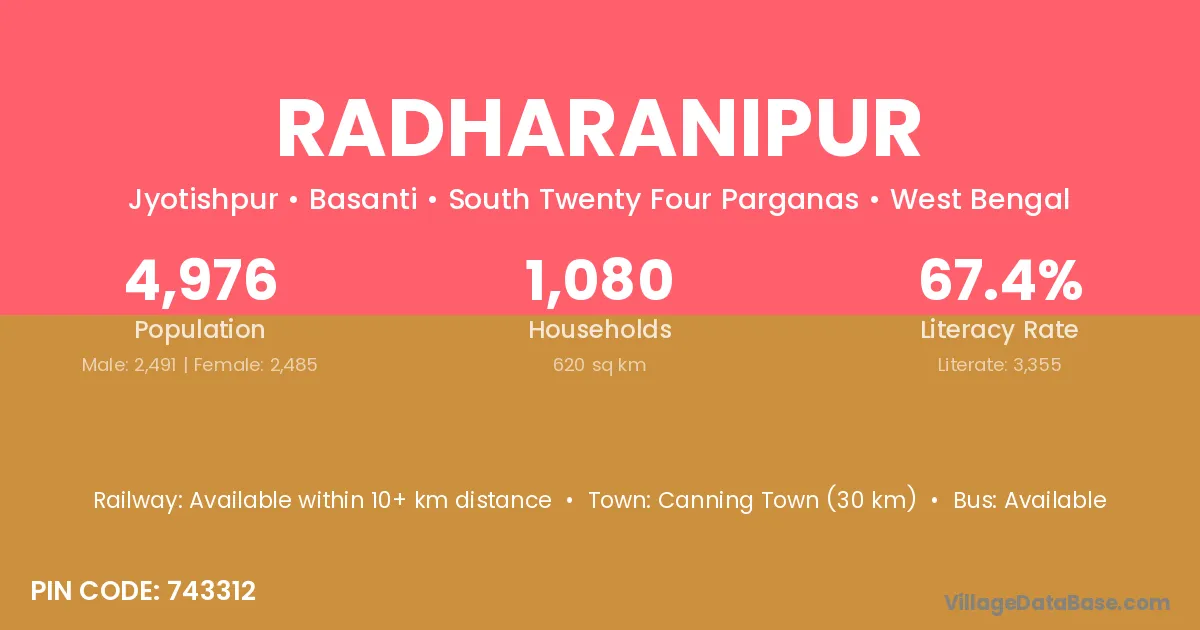 Canning Town (30 km) is the nearest town to Radharanipur village for major economic activities and is located approximately 30 km away.