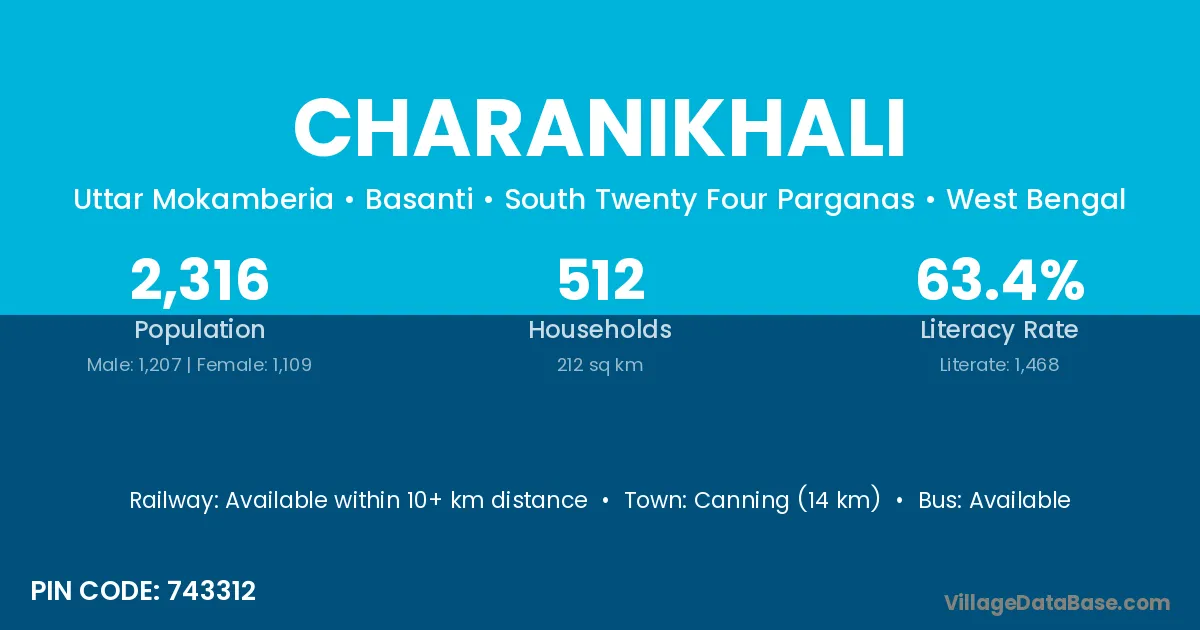 Canning (14 km) is the nearest town to Charanikhali village for major economic activities and is located approximately 14 km away.