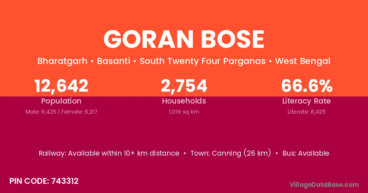 Canning (26 km) is the nearest town to Goran Bose village for major economic activities and is located approximately 26 km away.
