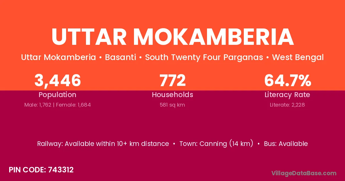 Canning (14 km) is the nearest town to Uttar Mokamberia village for major economic activities and is located approximately 14 km away.