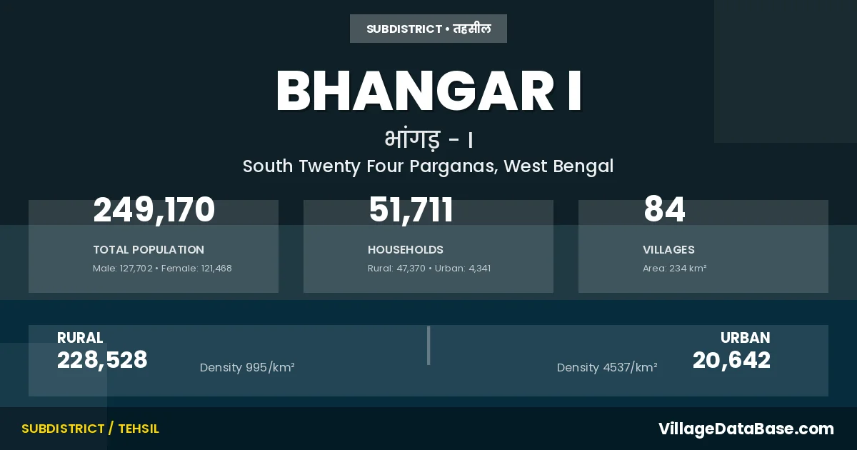 According to the 2011 census The total area of Bhangar I Subdivision is 234 km², with a population of 249170 people. The population density is 1,063 inhabitants per square kilometre, and there are approximately 51711 houses in the sub district.