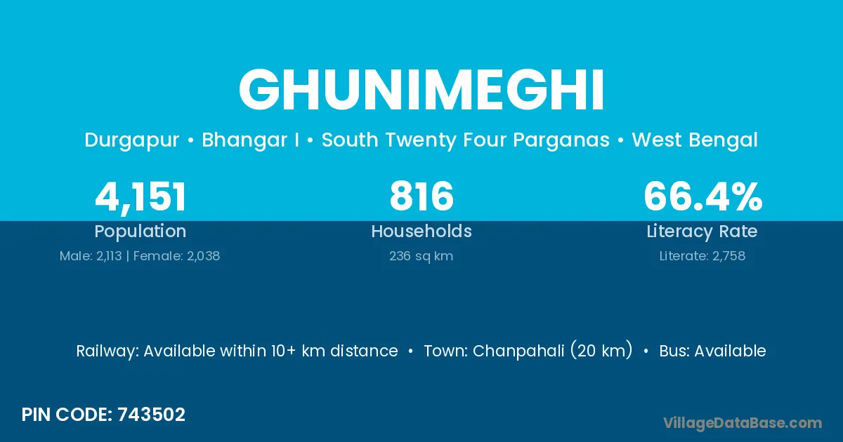 Ghunimeghi village is located in the Bhangar I Subdivision of the South Twenty Four Parganas district in West Bengal.
