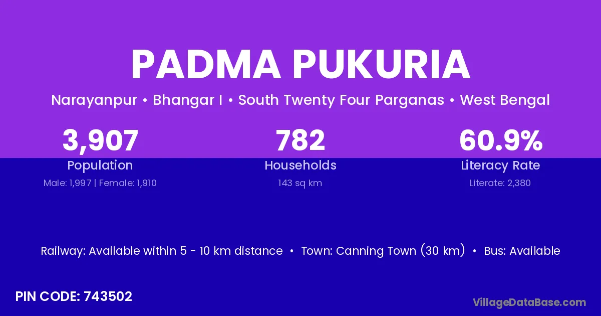 Canning Town (30 km) is the nearest town to Padma Pukuria village for major economic activities and is located approximately 30 km away.