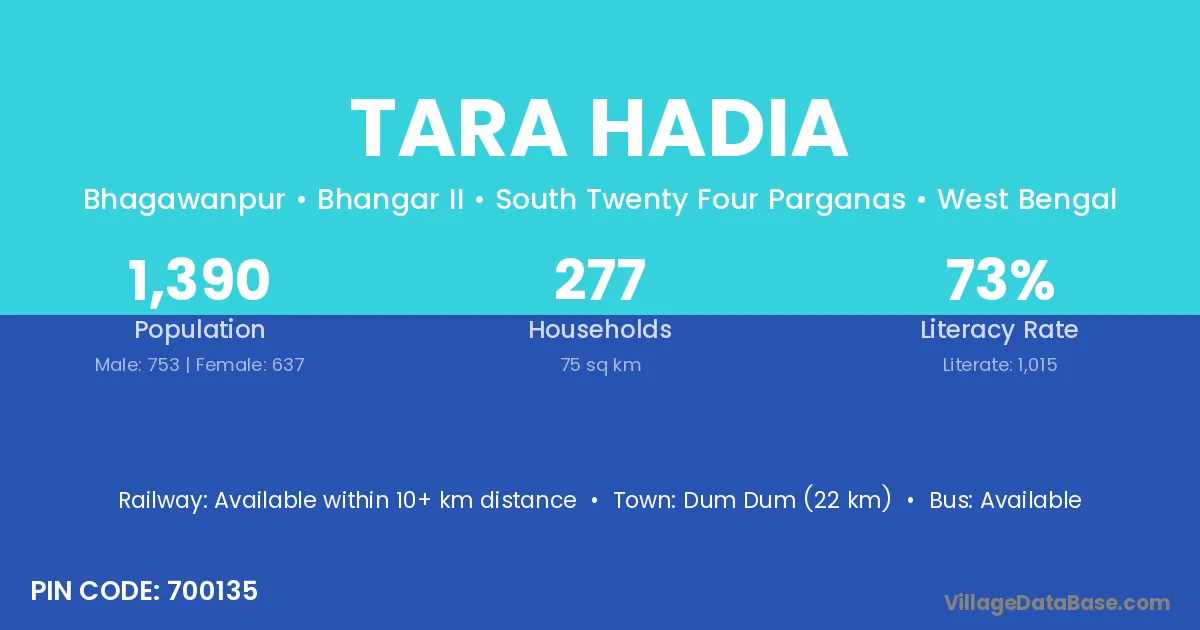 Dum Dum (22 km) is the nearest town to Tara Hadia village for major economic activities and is located approximately 22 km away.