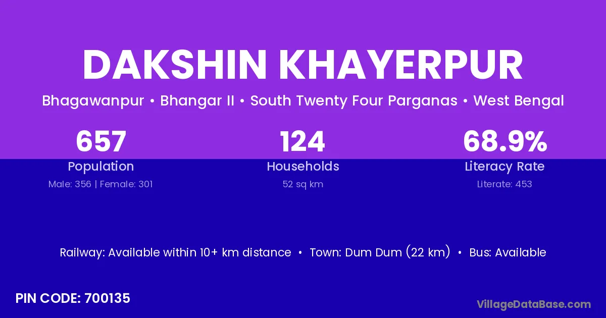 Dum Dum (22 km) is the nearest town to Dakshin Khayerpur village for major economic activities and is located approximately 22 km away.
