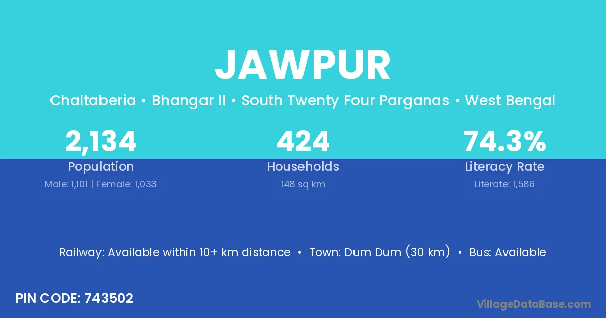 Dum Dum (30 km) is the nearest town to Jawpur village for major economic activities and is located approximately 30 km away.