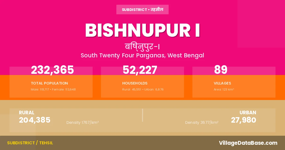 According to the 2011 census The total area of Bishnupur I Subdivision is 123 km², with a population of 232365 people. The population density is 1,885 inhabitants per square kilometre, and there are approximately 52227 houses in the sub district.