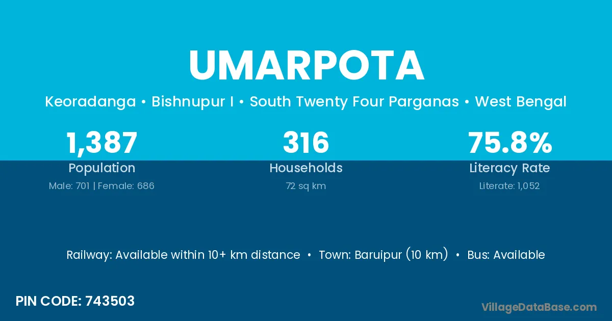 Baruipur (10 km) is the nearest town to Umarpota village for major economic activities and is located approximately 10 km away.