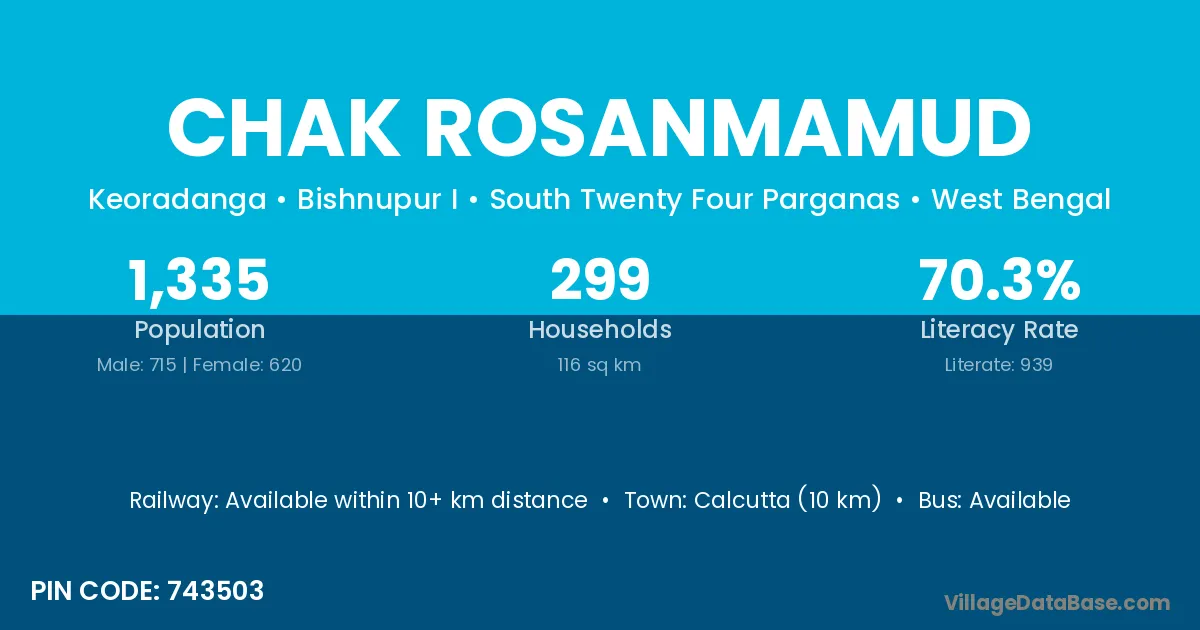 Calcutta (10 km) is the nearest town to Chak Rosanmamud village for major economic activities and is located approximately 10 km away.