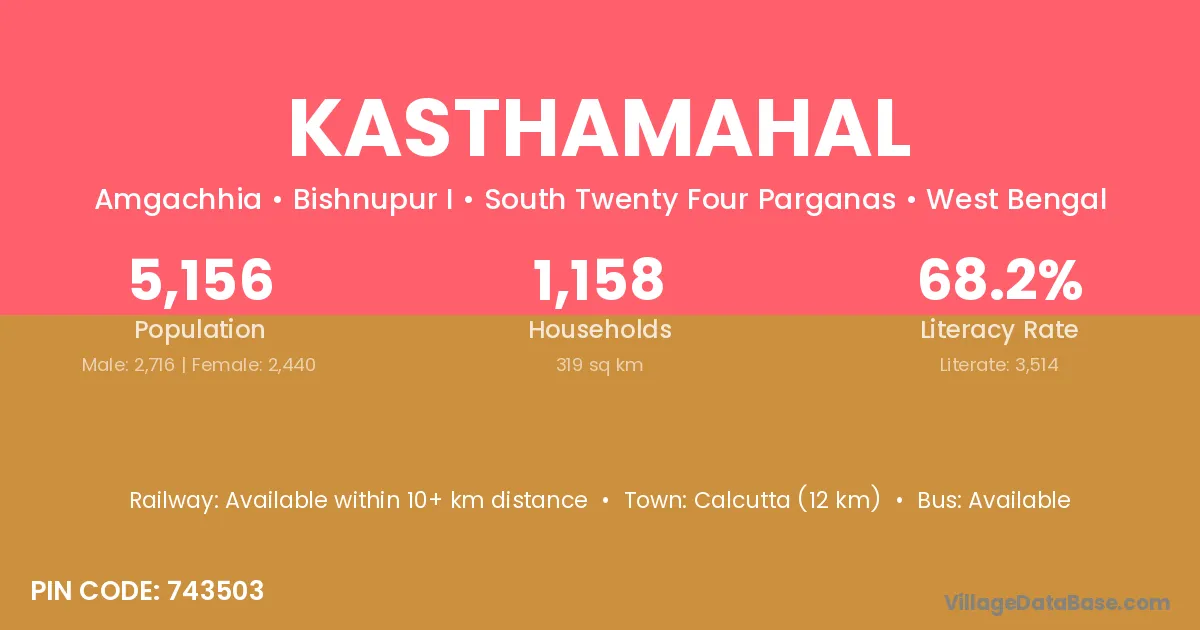 Kasthamahal village is located in the Bishnupur I Subdivision of the South Twenty Four Parganas district in West Bengal.