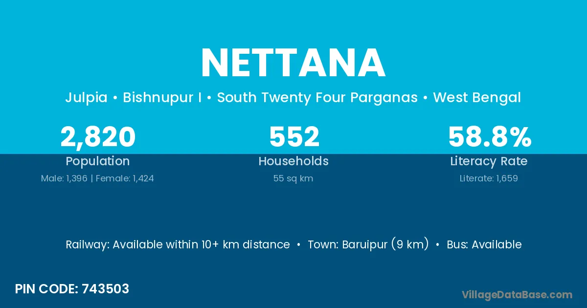 Baruipur (9 km) is the nearest town to Nettana village for major economic activities and is located approximately 9 km away.