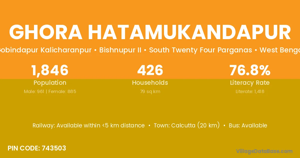 Calcutta (20 km) is the nearest town to Ghora Hatamukandapur village for major economic activities and is located approximately 20 km away.