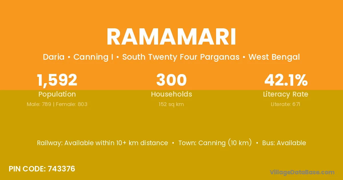 Canning (10 km) is the nearest town to Ramamari village for major economic activities and is located approximately 10 km away.