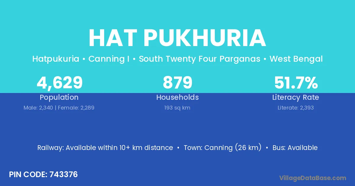 Hat Pukhuria village is located in the Canning I Subdivision of the South Twenty Four Parganas district in West Bengal.