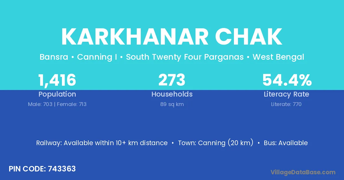 Canning (20 km) is the nearest town to Karkhanar Chak village for major economic activities and is located approximately 20 km away.