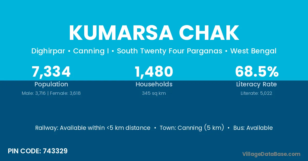 Canning (5 km) is the nearest town to Kumarsa Chak village for major economic activities and is located approximately 5 km away.