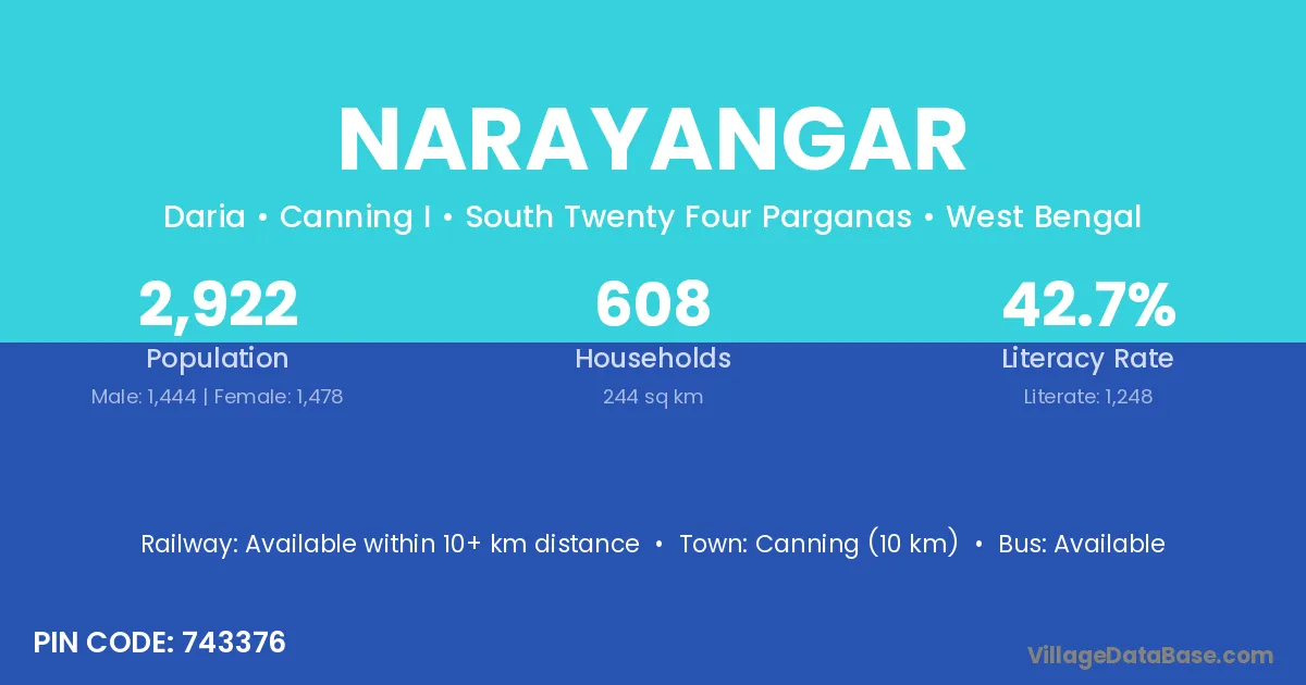 Canning (10 km) is the nearest town to Narayangar village for major economic activities and is located approximately 10 km away.