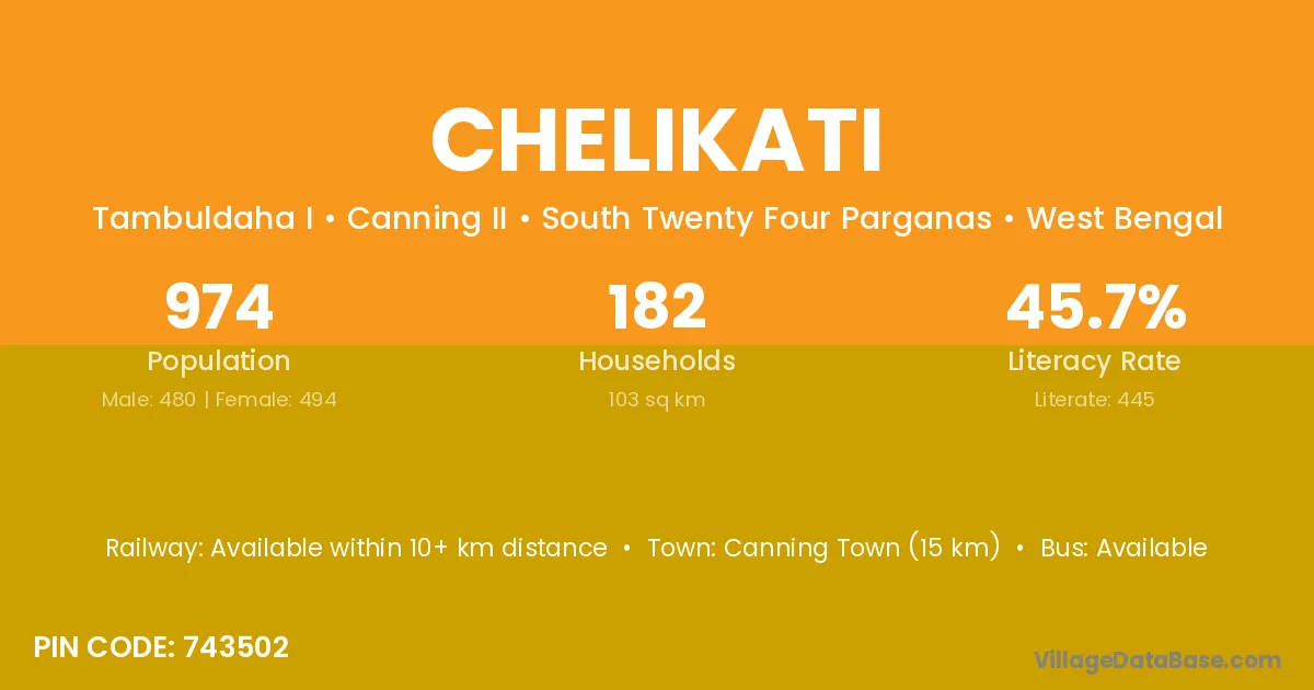 Canning Town (15 km) is the nearest town to Chelikati village for major economic activities and is located approximately 15 km away.