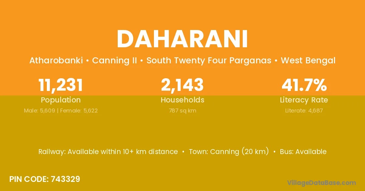 Canning (20 km) is the nearest town to Daharani village for major economic activities and is located approximately 20 km away.